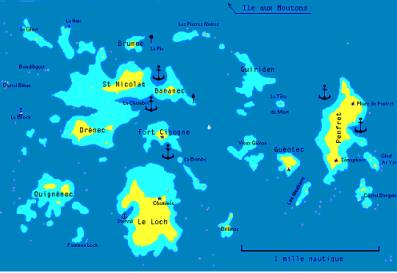 Ce petit archipel est un ensemble de treize îles et d'une multitude d'îlots, de roches et de récifs, situé à 10 milles au large de Concarneau. Les quatre plus importantes Penfret, Drennec, Loch et Saint-Nicolas encadrent un lagon appelé la Chambre. En hiver, seuls les goélands et quelques pêcheurs fréquentent le site. Peu élevées et en grande partie sablonneuses, les îles portent une végétation basse composée principalement d'herbes tenaces, de chardons, et d'une variété unique de narcisse. Cet archipel au goût de paradis, réserve naturelle protégée, offre des plages de sable blanc et fin, des eaux limpides et claires, une faune et une flore qui donnent un spectacle quasi-irréel . |